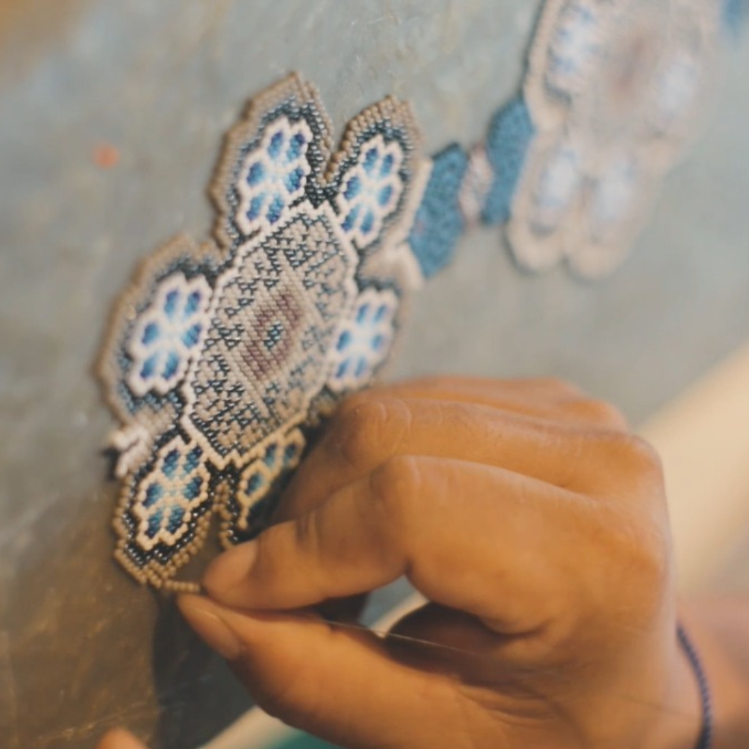 Chaquira coloured beads and natural beeswax is used to apply them.