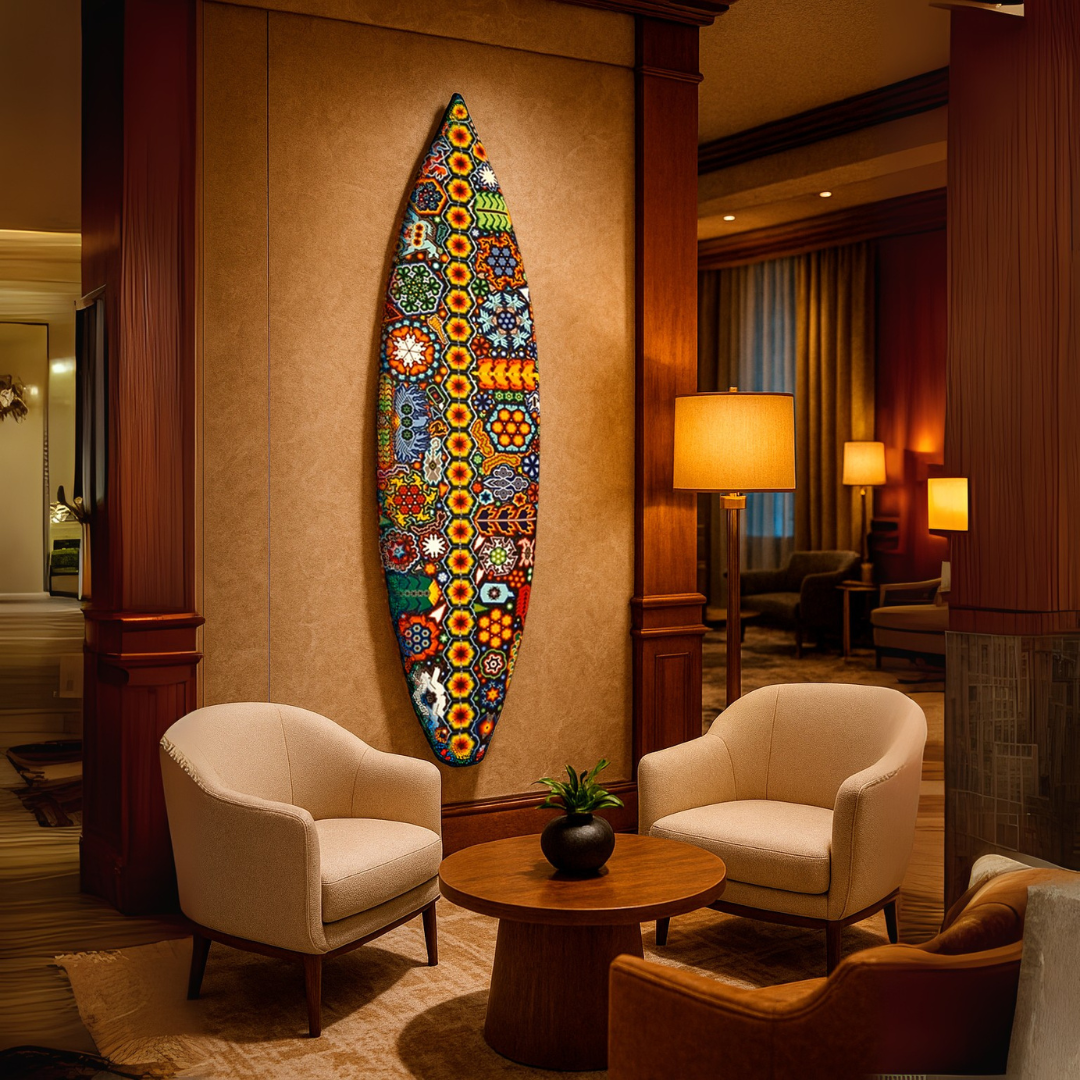 Experience the epitome of joy, adventure, and vibrant energy with our Huichol beaded surfboard. Handcrafted with meticulous care, each surfboard seamlessly blends the thrill of surfing with the cultural richness of Huichol beading. Elevate your space with the most incredible piece that radiates positivity and adds a touch of unparalleled beauty to any environment.