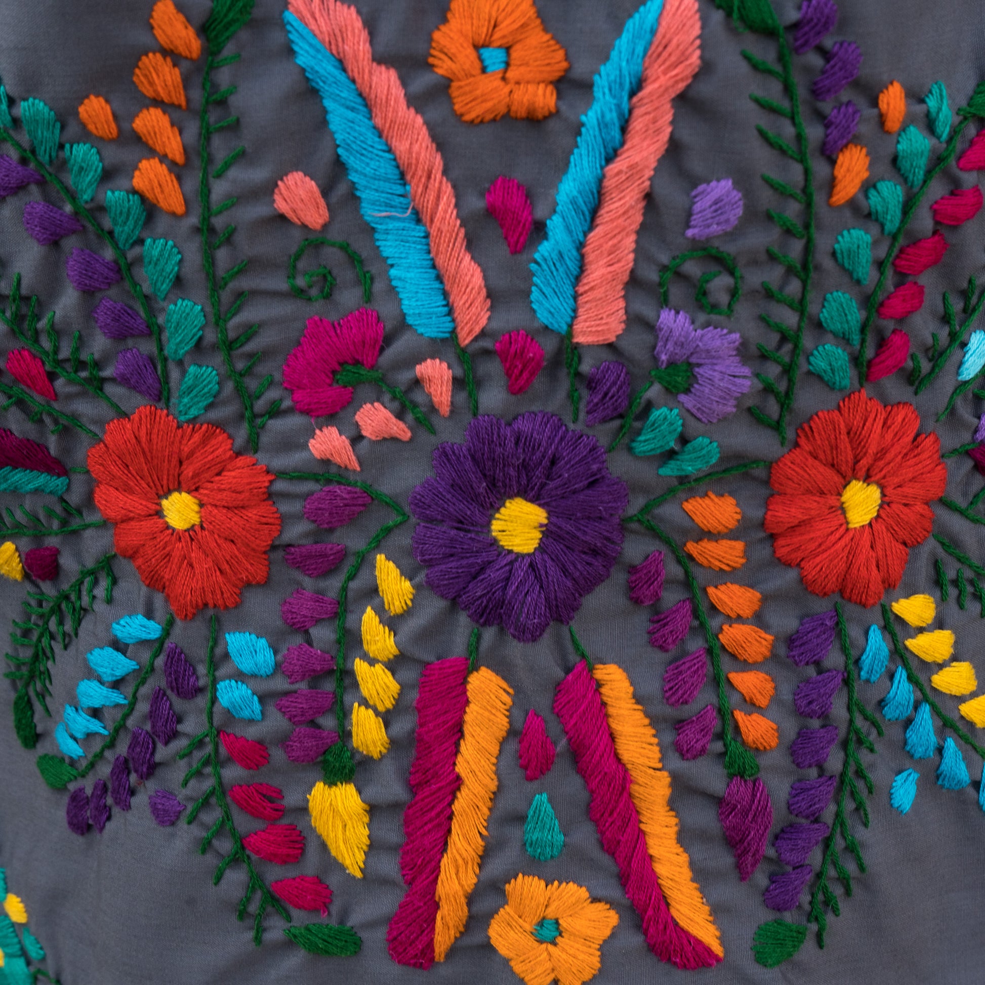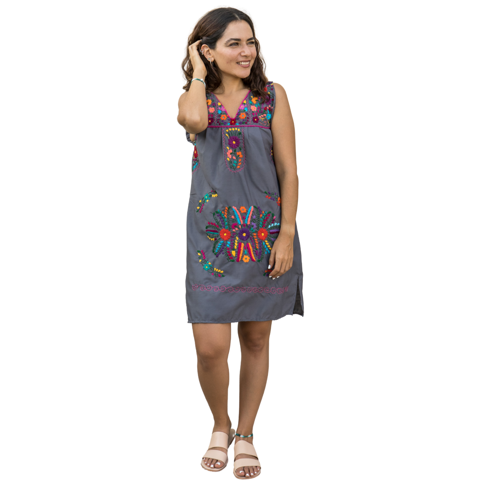 This incredibly fresh and light dress is amazing for spring and summer, easily slips on for a casual day look or can even be dressed up with a pair of heels for a fun night out. The one-of-a-kind hand embroidered detail adds the perfect hint of Mexico.