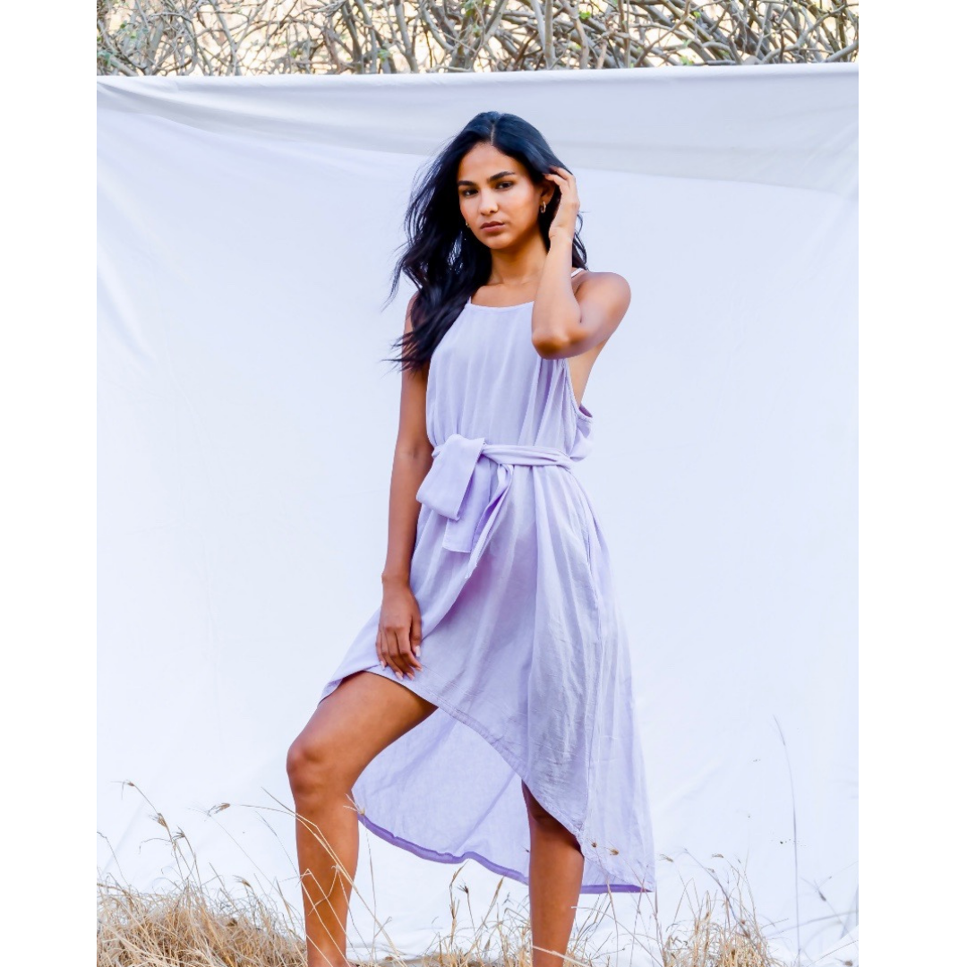 100% soft and light cotton halter dress with pockets on the sides and a waist strap. Feels like a cloud on the skin.