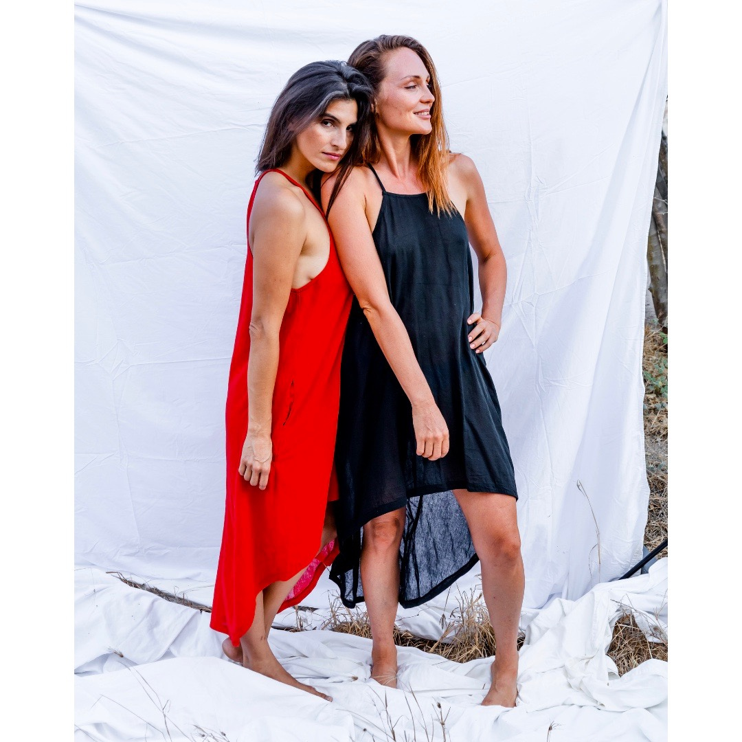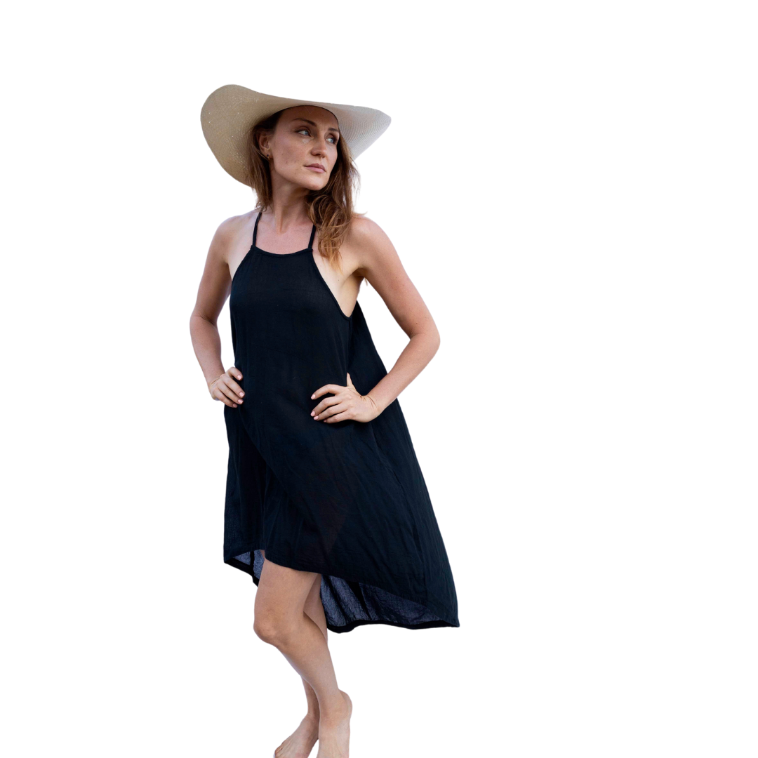 100% soft and light cotton halter dress with pockets on the sides and a waist strap. Feels like a cloud on the skin.
