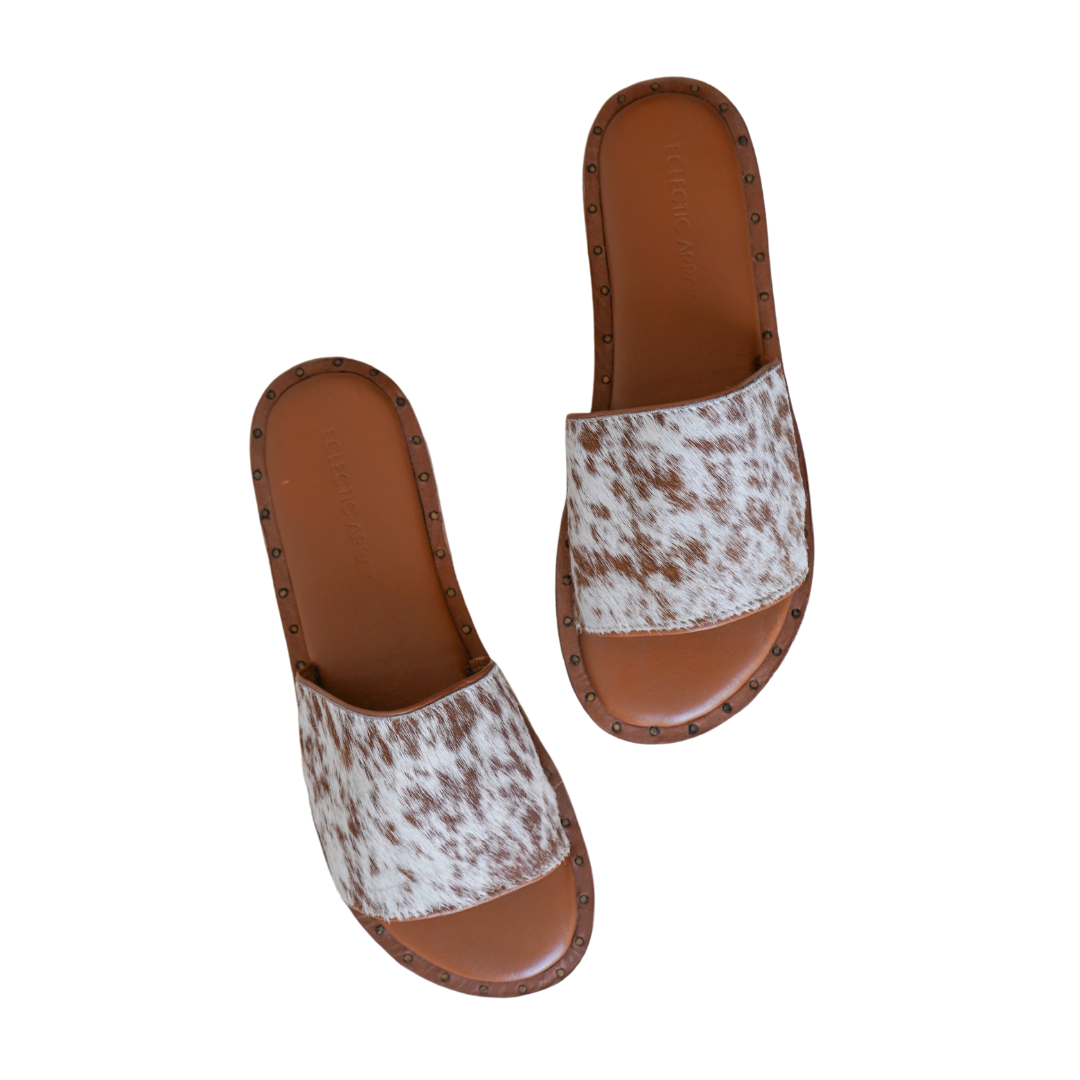Slide into these versatile sandals, featuring a cushioned leather insole with beautiful and unique cowhide leather.