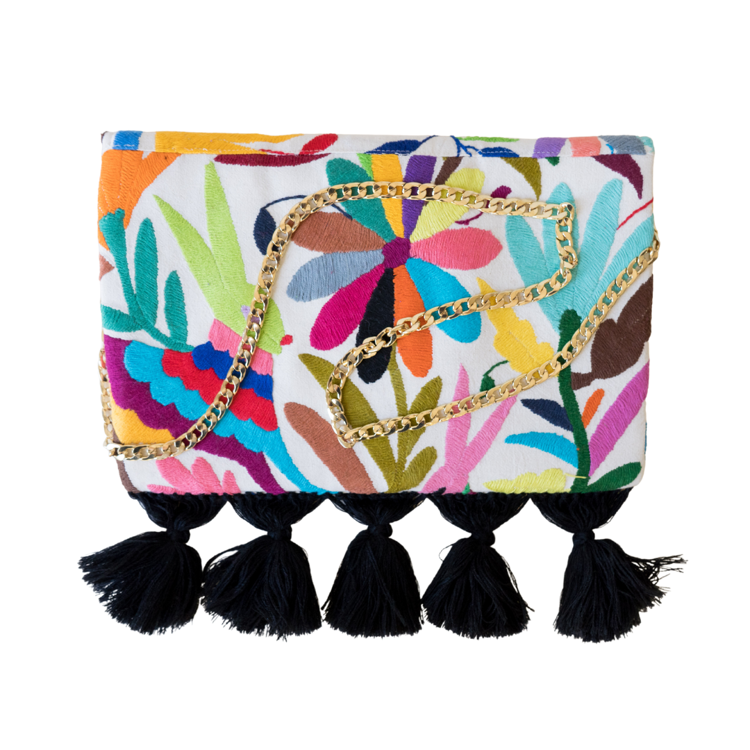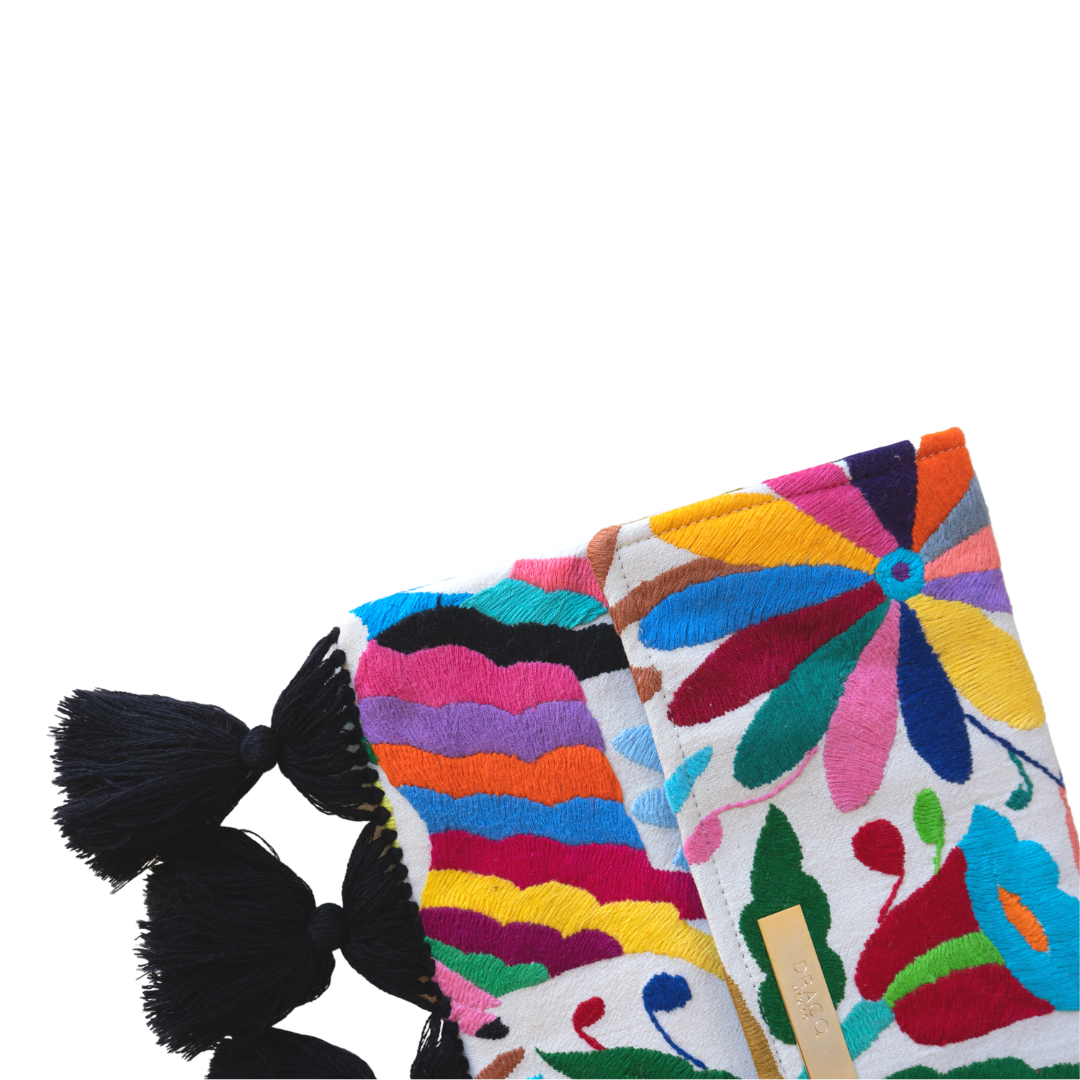Add a touch of Mexican heritage to your style with this stunning Otomi embroidered clutch with tassels. Each piece is a testament to traditional craftsmanship, featuring intricate, hand-stitched motifs that take up to a month to complete. This clutch is more than an accessory; it's a statement of culture, color, and artistry, perfect for enhancing any look with authentic flair.