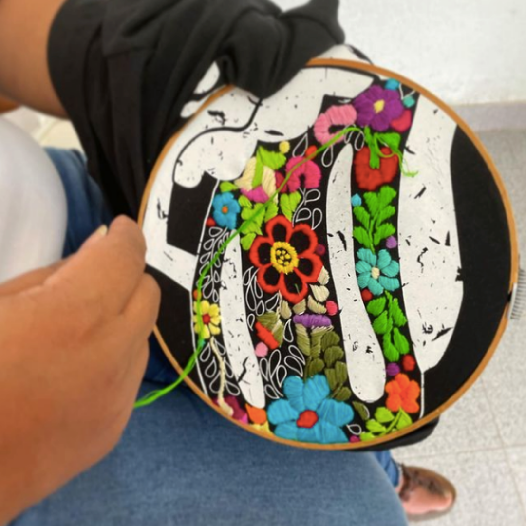 The manual serigraph and embroidered process are done by women artisans in Mitla Oaxaca. This type of embroidery consists of almost 15 different techniques thought from one generation to the other and carries a specific meaning in every thread stitch.