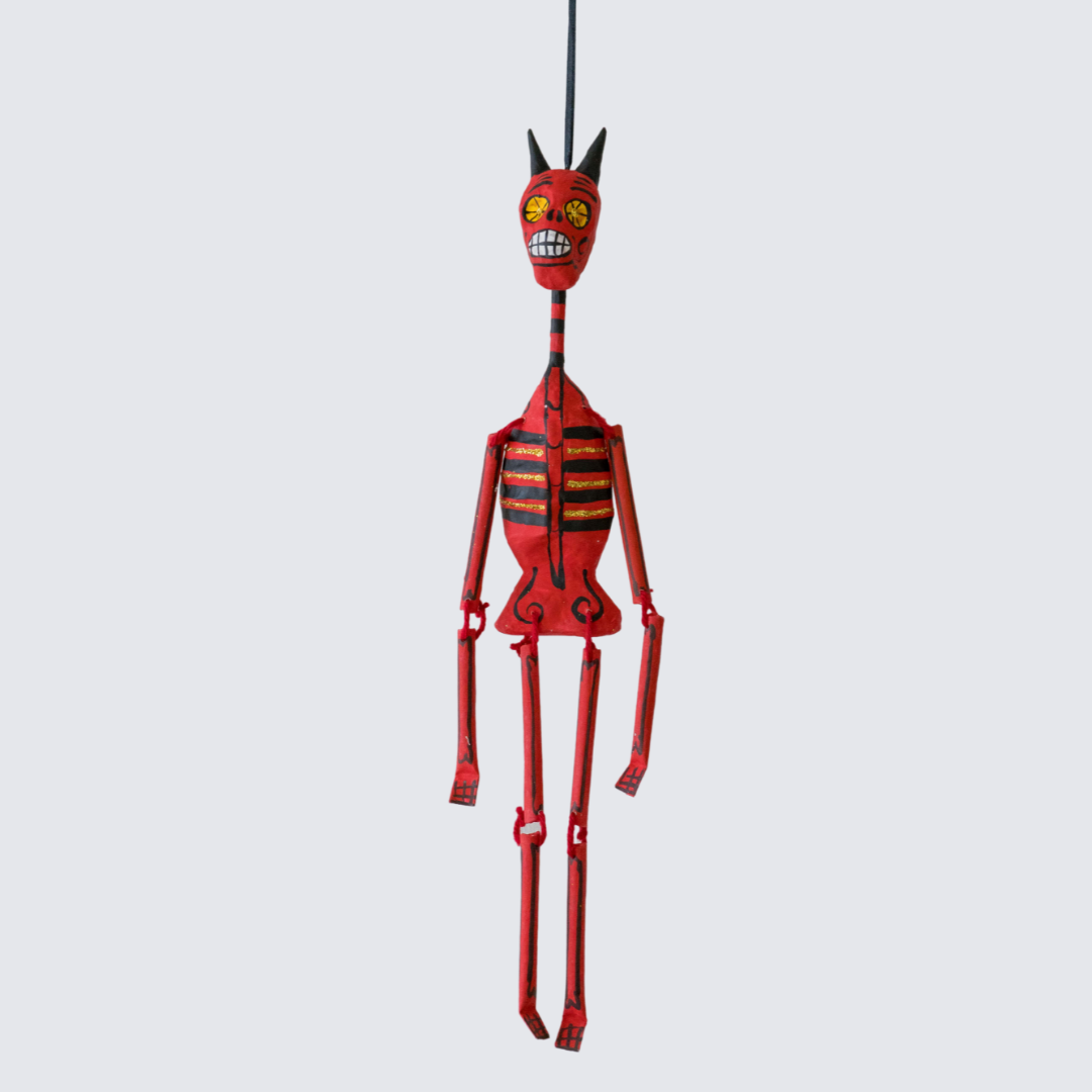 This playful Diablito figurine is a colorful piece of Mexican folk art, handcrafted from paper mache in San Miguel de Allende by artisan couple Lupita and Pedro, who have passed down this tradition through generations.