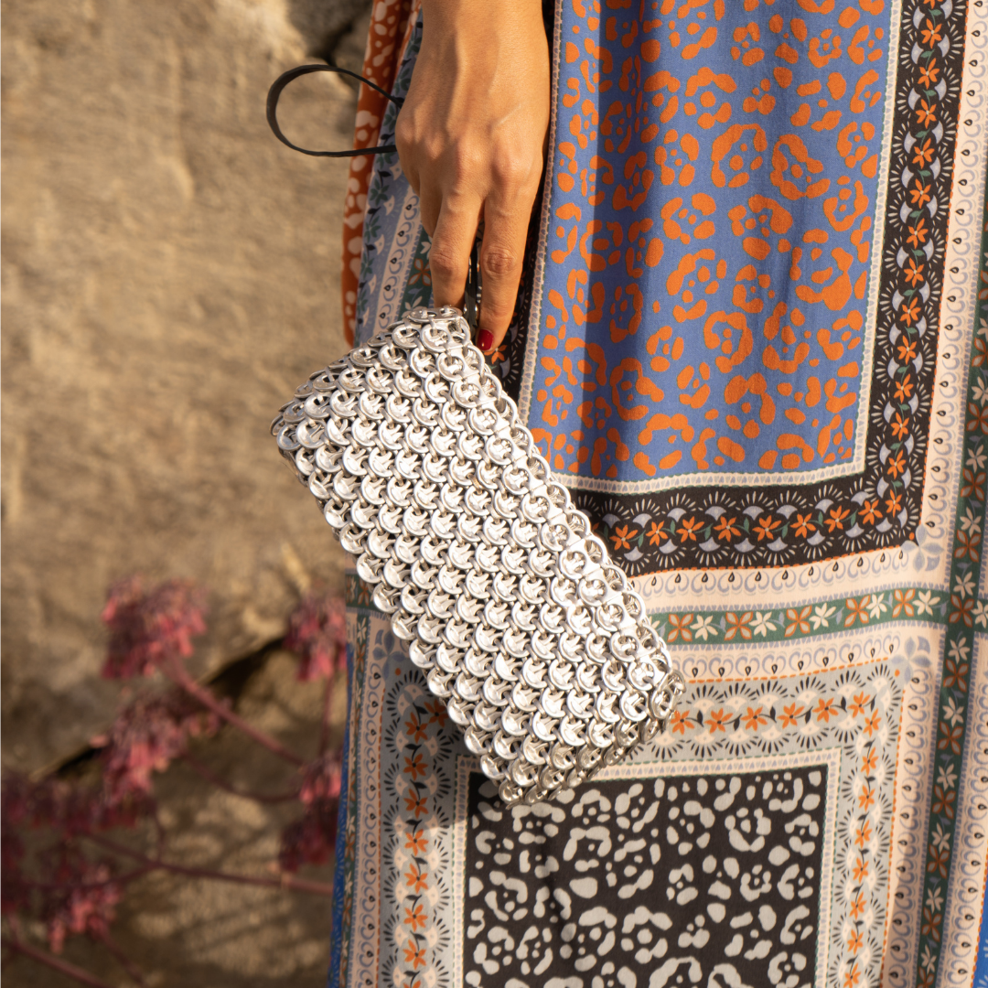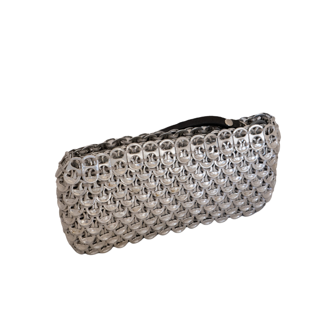 This amazing bag is made from reused pop-top bags, inner tubes, used tires, discarded plastic from billboards and soda cans.