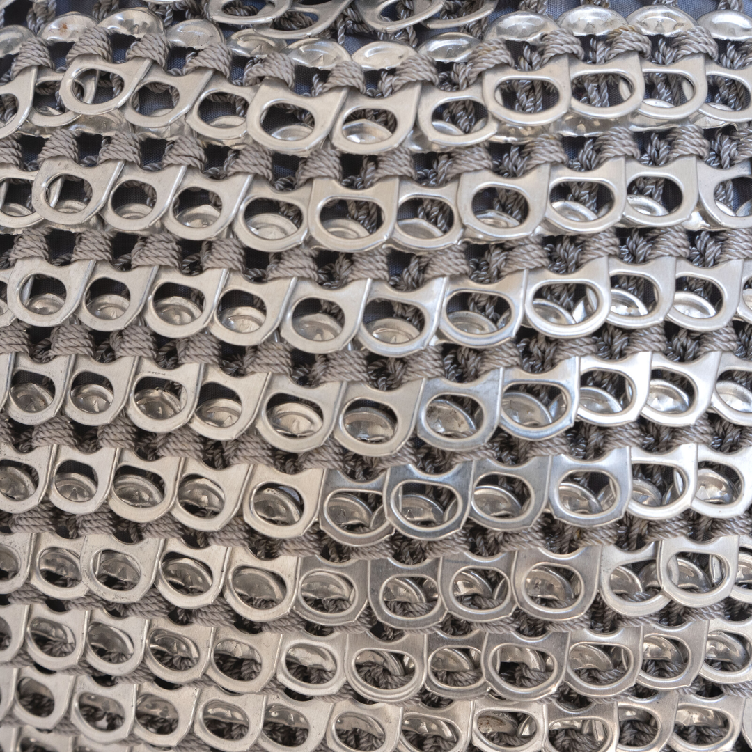 reused pop-top bags, inner tubes, used tires, discarded plastic from billboards and soda cans.
