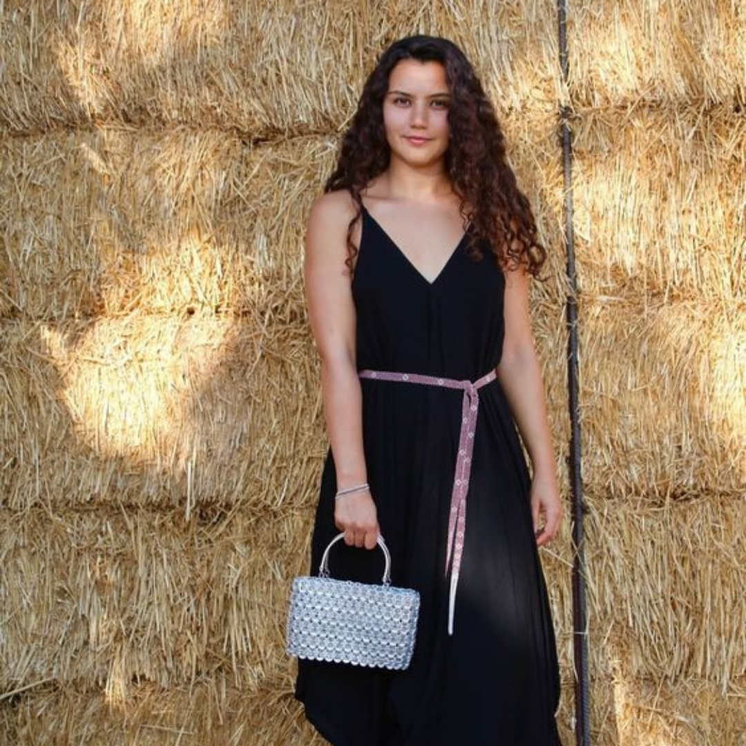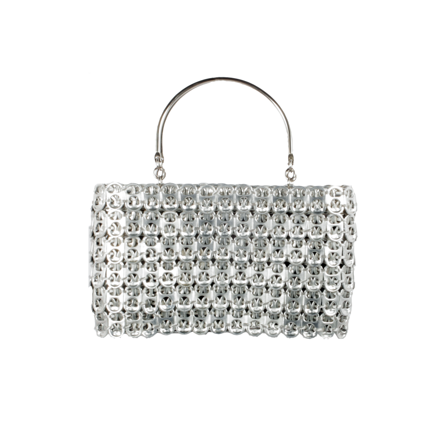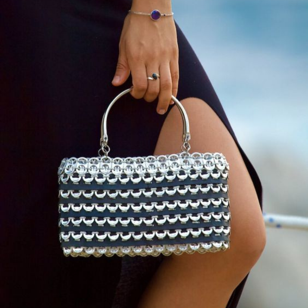 This amazing bag is made from reused pop-top bags, inner tubes, used tires, discarded plastic from billboards and soda cans.