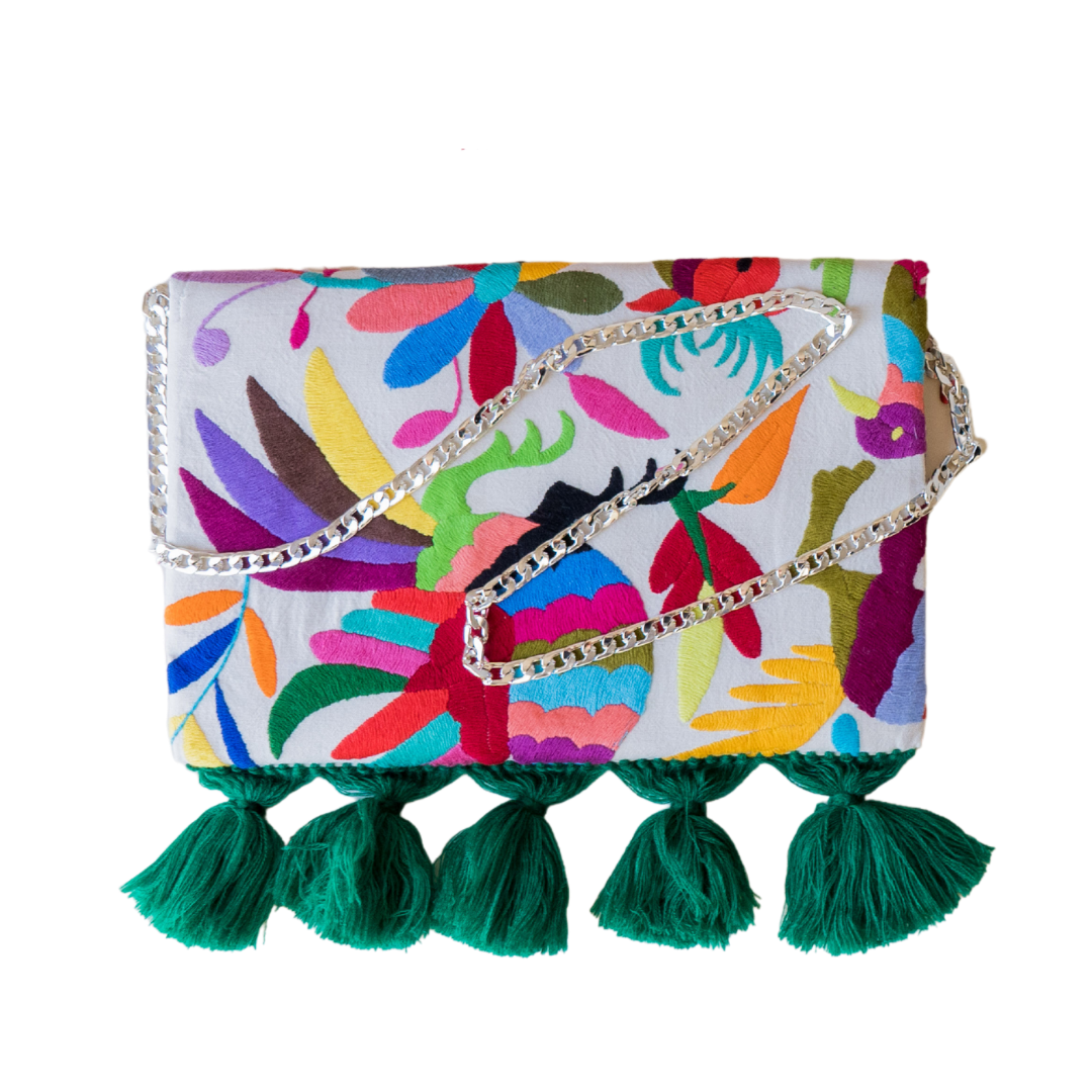 Add a touch of Mexican heritage to your style with this stunning Otomi embroidered clutch with tassels. Each piece is a testament to traditional craftsmanship, featuring intricate, hand-stitched motifs that take up to a month to complete. This clutch is more than an accessory; it's a statement of culture, color, and artistry, perfect for enhancing any look with authentic flair.