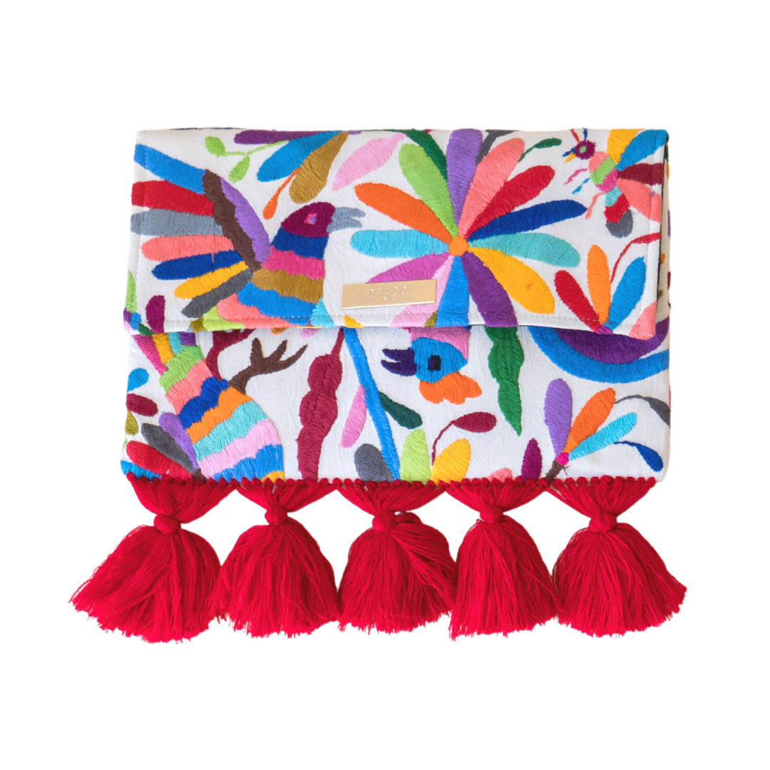 Add a touch of Mexican heritage to your style with this stunning Otomi embroidered clutch with tassels. Each piece is a testament to traditional craftsmanship, featuring intricate, hand-stitched motifs that take up to a month to complete. This clutch is more than an accessory; it's a statement of culture, color, and artistry, perfect for enhancing any look with authentic flair.
