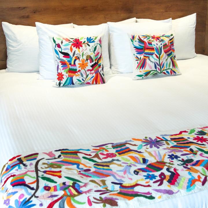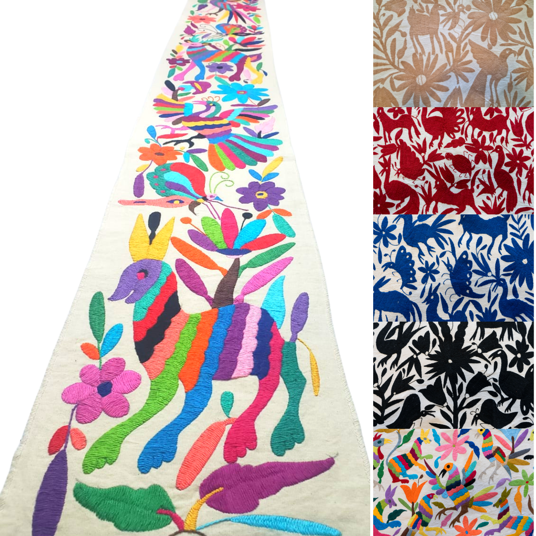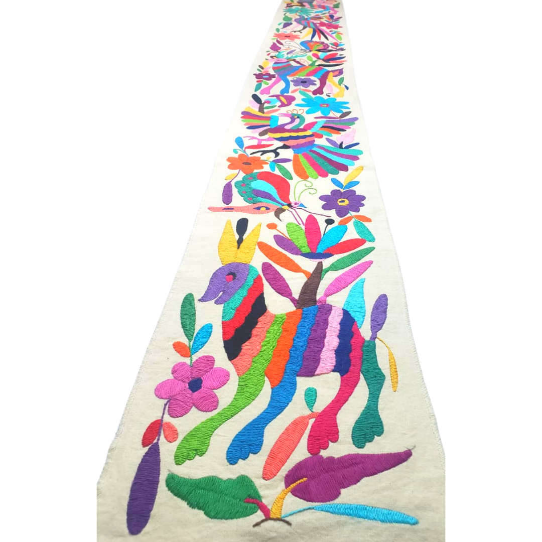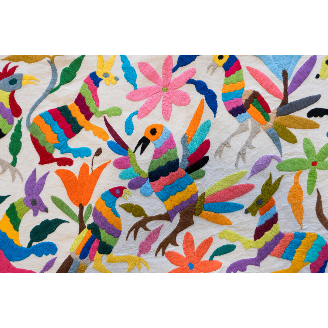 This traditional textile comes all the way up from the Sierra Madre Oriental Mountains in the state of Hidalgo, right up North of Mexico City. Where men are typically the ones that free-hand draw the designs onto the raw textile or off-white fabric that is then embroidered by the women. The figures are typical stories or representations or life that have been taught to generations.