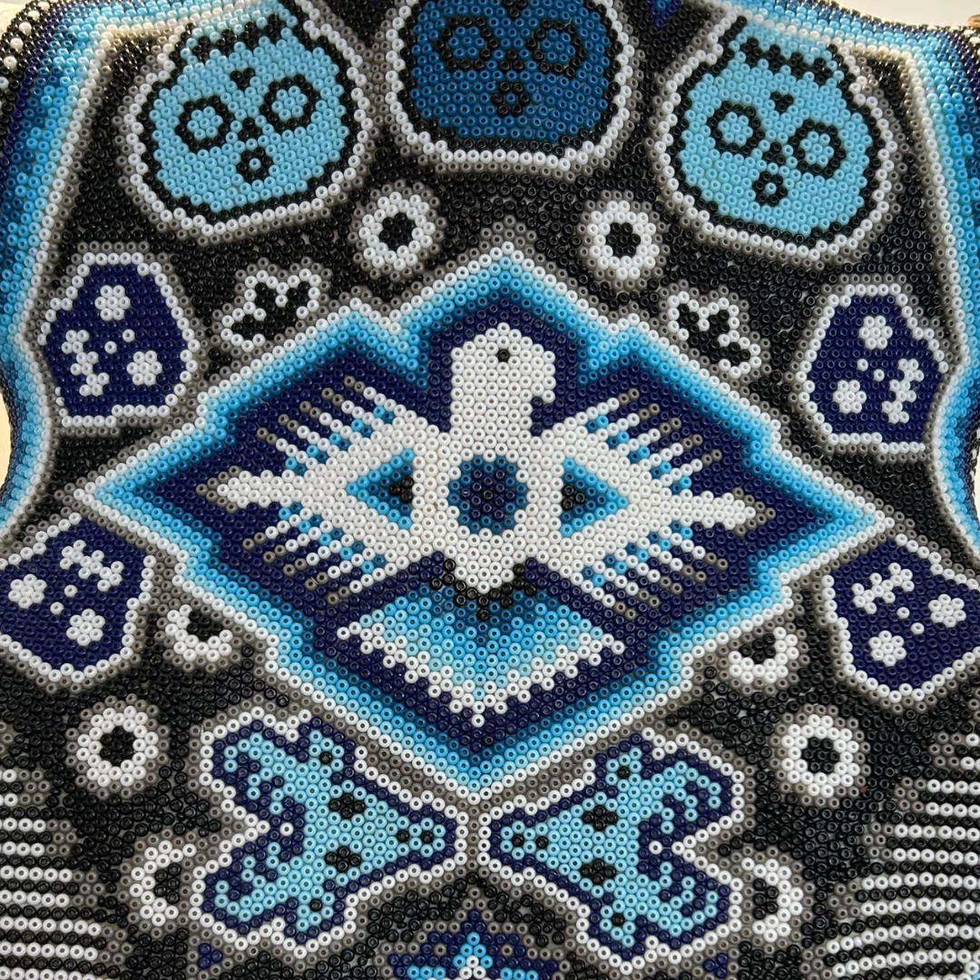 These extraordinary pieces are made by Huichol artisans from Mexico living in the Sierra Madre Occidental. All of the threaded symbols represent the culture and nature surrounding them.