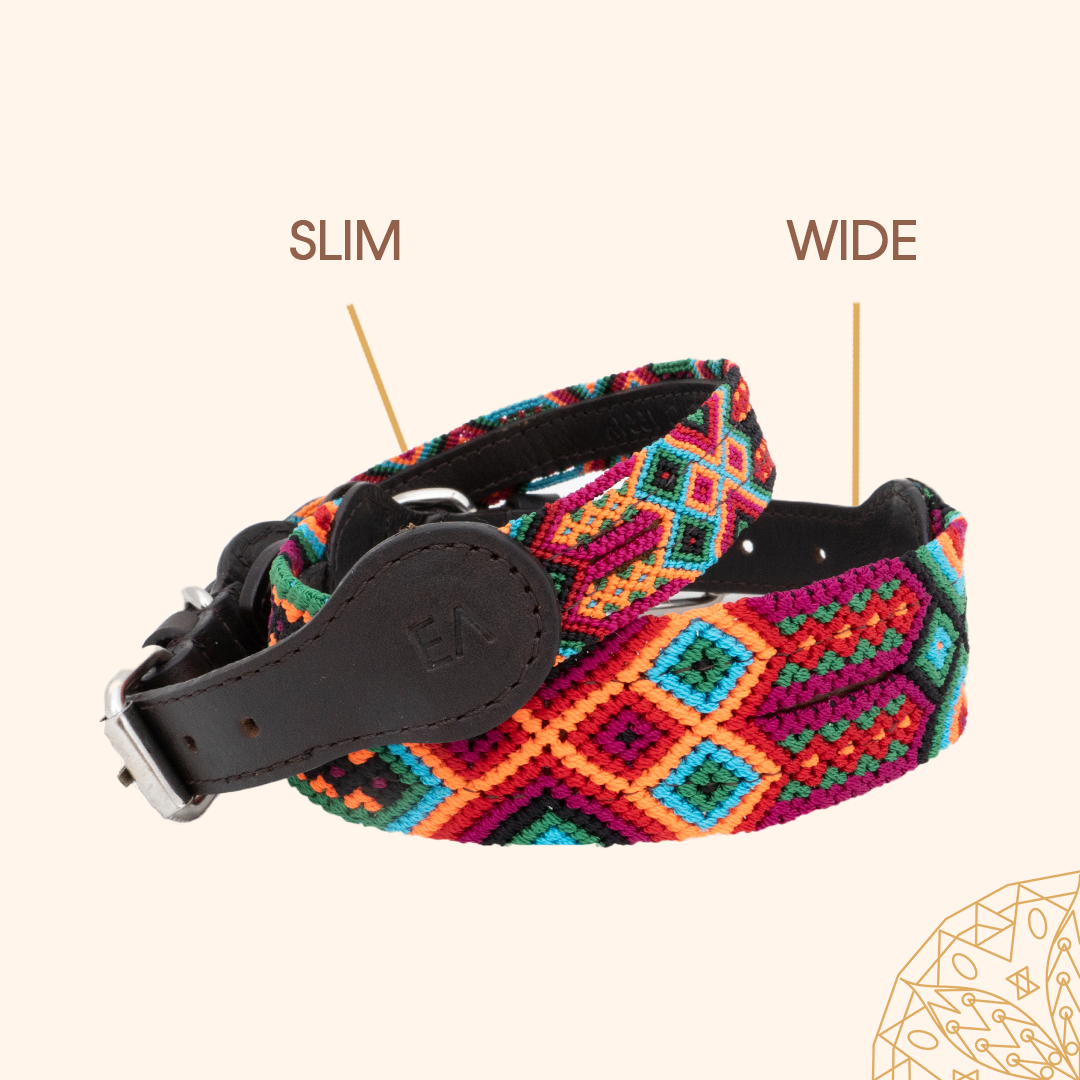 Each embroidered dog collar is crafted with exceptional care and pride by a Mexican Artisan. The collars are made by repurposing traditional macrame belts and a high-quality soft leather backing.