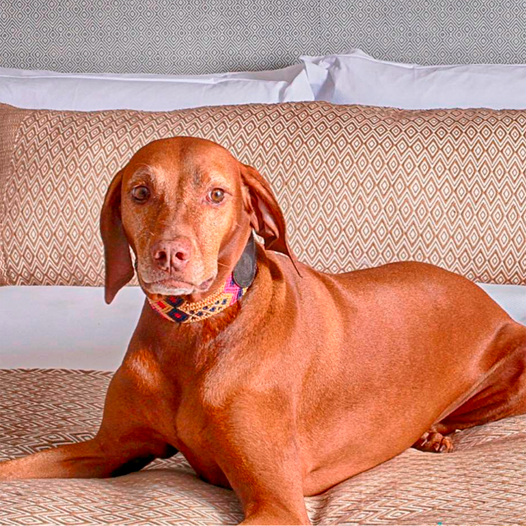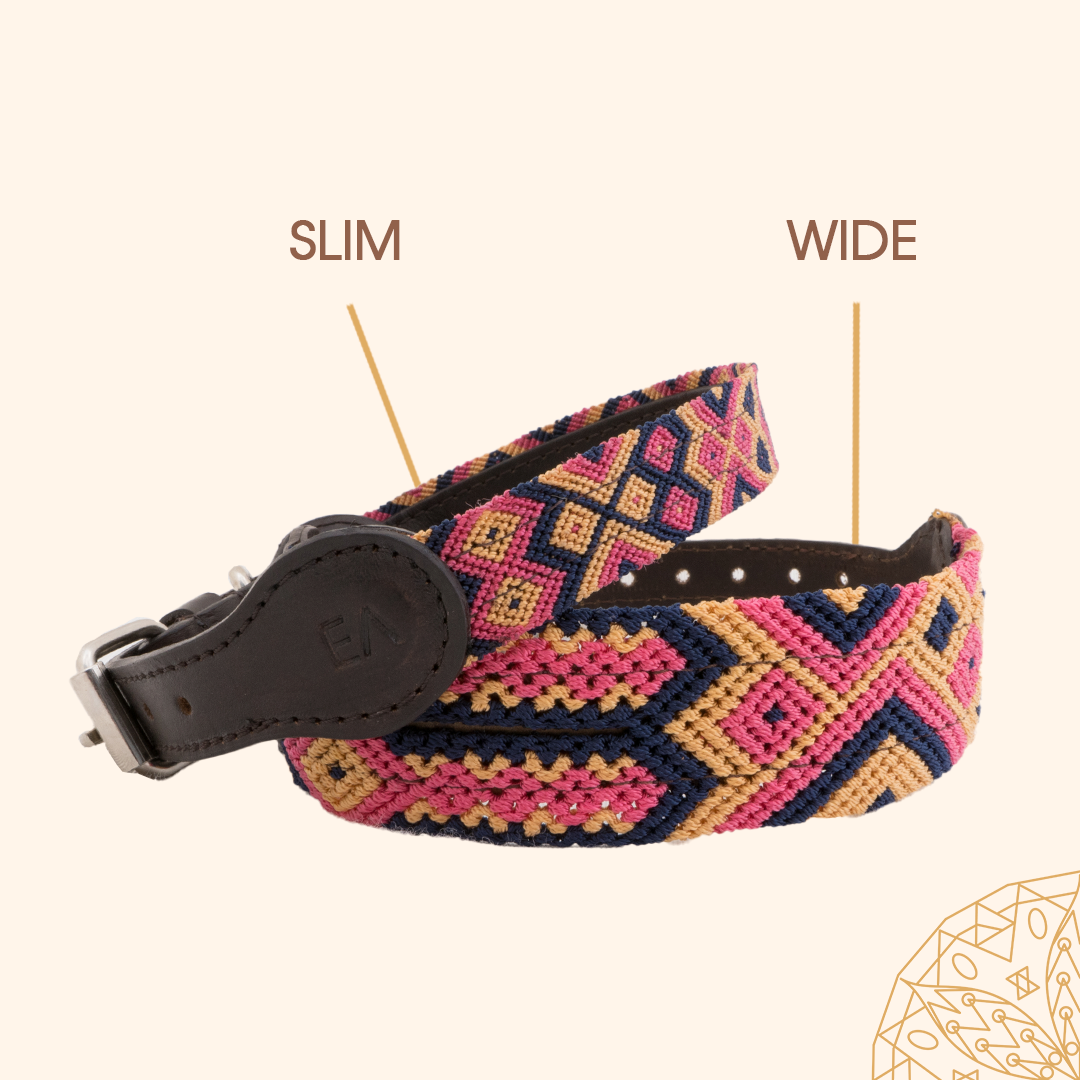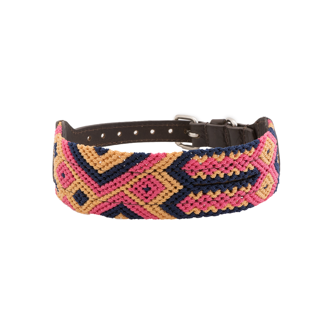Each embroidered dog collar is crafted with exceptional care and pride by a Mexican Artisan. The collars are made by repurposing traditional macrame belts and a high-quality soft leather backing.