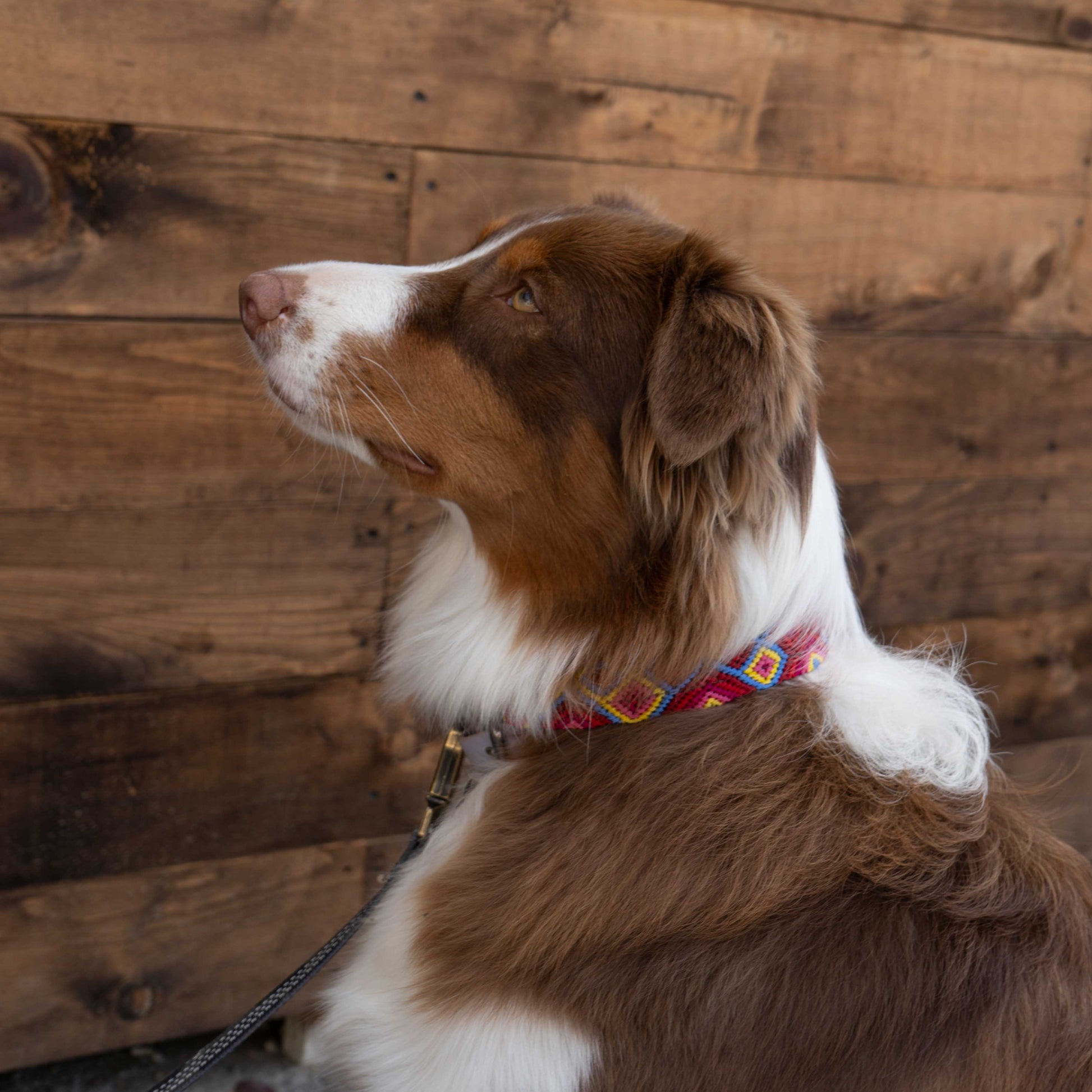 Each embroidered dog collar is crafted with exceptional care and pride by a Mexican Artisan. The collars are made by repurposing traditional macrame belts and a high-quality soft leather backing.