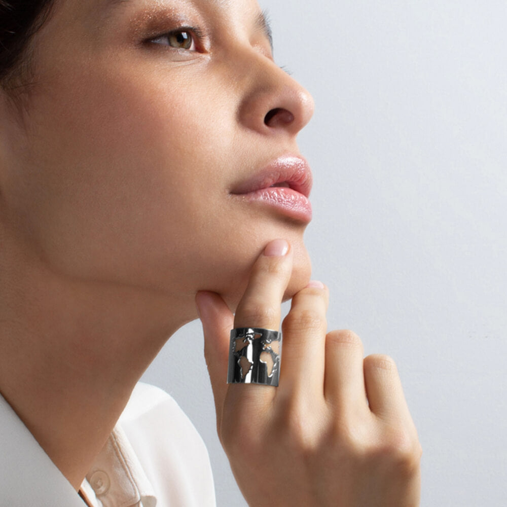 The World Long Ring features an intricate design of the world, elegantly highlighting all the countries across the globe. The ring is delicate and refined, perfectly pairing with any stylish wardrobe.